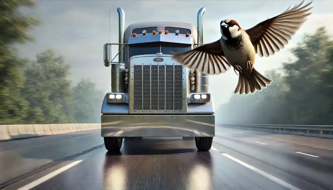 Νταλίκα σε κορυφαίο ανέκδοτο: Σε μια μεγάλη ευθεία της εθνικής οδού, ένα σπουργιτάκι χτυπάει με δύναμη στο παρμπρίζ μιας νταλίκας που τρέχει