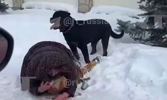 Στο βίντεο, η γυναίκα φαίνεται να έχει «ασπίδα» πάνω από το μικρό παιδί της πεσμένη μαζί του στο χιόνι που έχει βαφτεί κόκκινο με το αίμα από την επίθεση και το ροτβάιλερ να καιροφυλακτεί έτοιμο να επιτεθεί ξανά και απειλώντας το πλήθος που έχει συγκετρωθεί για να βοηθήσει