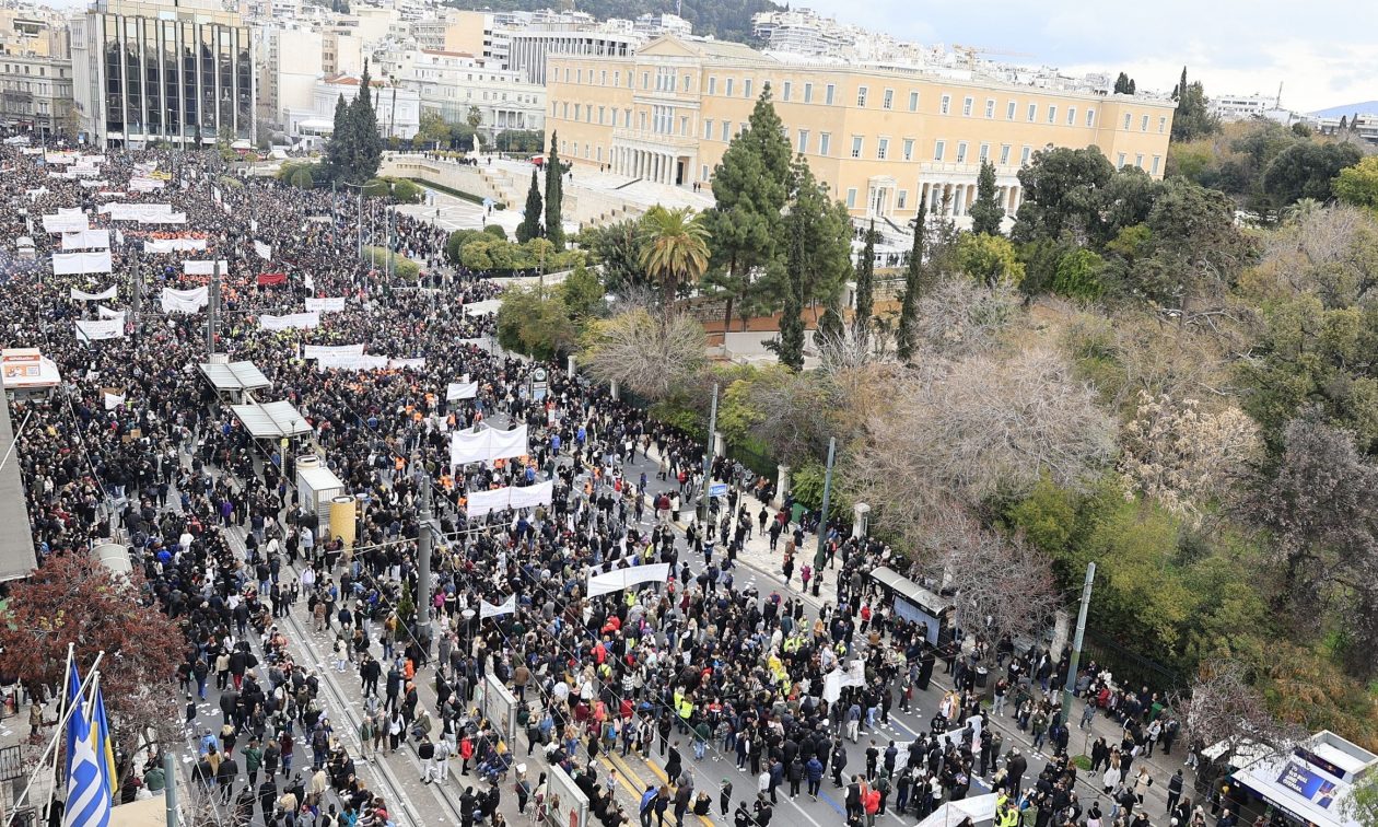 Πλήθος κόσμου δίνει το «παρών» στο κέντρο της Αθήνας για να στείλει σαφές μήνυμα υπέρ της δικαίωσης των 57 ψυχών που χάθηκαν στο σιδηροδρομικό δυστύχημα στα Τέμπη.
