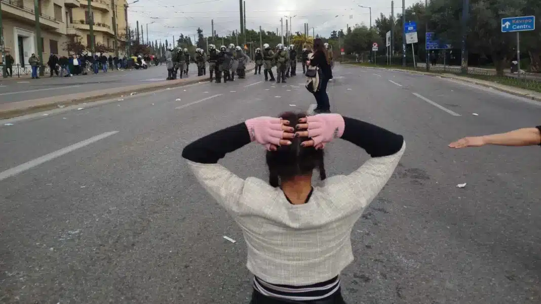 Τα χέρια ψηλά σηκώνει μια διαδηλώτρια στη λεωφόρο Βασιλίσσης Όλγας στο Σύνταγμα. Απέναντί της, αλλά σε απόσταση, βρίσκονται παραταγμένοι, αστυνομικοί των ΜΑΤ. Η στιγμή έλαβε χώρα μετά το συλλαλητήριο για τα Τέμπη και αποτυπώθηκε από τον φωτογραφικό φακό.