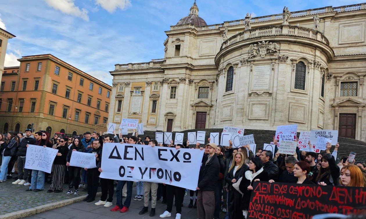 Πάνω από εκατόν πενήντα άνθρωποι συμμετείχαν, σήμερα το απόγευμα, στην πλατεία Εσκουιλίνο της Ρώμης, σε συγκέντρωση για τα δυο χρόνια από την τραγωδία των Τεμπών.