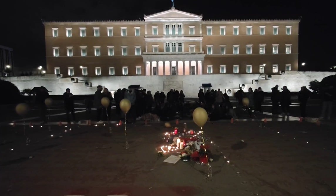 Τέμπη: Καθιστική διαμαρτυρία στο πλαίσιο της «μαύρης» επετείου της τραγωδίας των Τεμπών πραγματοποιήθηκε το βράδυ της Κυριακής, μπροστά από τη Βουλή