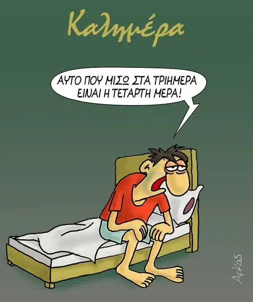 Στο σημερινό του σκίτσο, ένας εμφανώς ταλαιπωρημένος και αγουροξυπνημένος άνδρας κάθεται στο κρεβάτι του, προσπαθώντας να επανέλθει στην σκληρή πραγματικότητα. Με ύφος κουρασμένο και βλέμμα απελπισίας, εκφράζει αυτό που πολλοί σκέφτονται: «Αυτό που μισώ στα τριήμερα είναι η τέταρτη μέρα!».