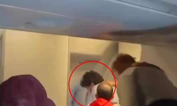 Στο βίντεο, που κάνει τον γύρο του διαδικτύου, φαίνεται ένας άνδρας να πλησιάζει την έξοδο κινδύνου και να προσπαθεί να την ανοίξει, ενώ το πλήρωμα και οι επιβάτες να προσπαθούν να τον σταματήσουν.