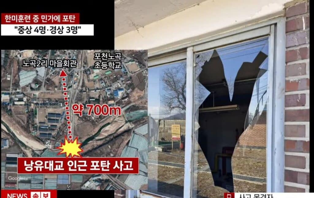 Breaking: Object presumed to be artillery shell lands in residential area in Pocheon, S. Korea. 7 injured (3 seriously) and multiple buildings damaged incl. church. Officials investigating if linked to nearby US-ROK military exercises and possible fighter jet weapons mishap. pic.twitter.com/L570RlGvL9