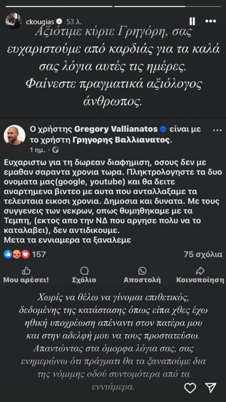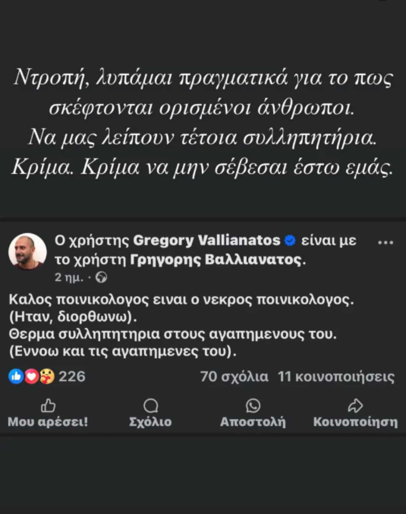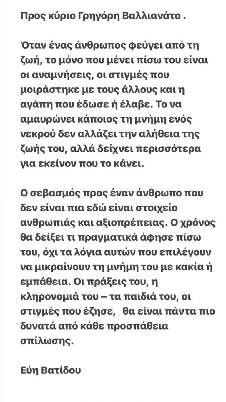 Μετά την κηδεία του Αλέξη Κούγια, ο Γρηγόρης Βαλλιανάτος επανήλθε με νέα ανάρτηση, αναφέροντας χαρακτηριστικά: «Μετά τα εννιάμερα τα ξαναλέμε».