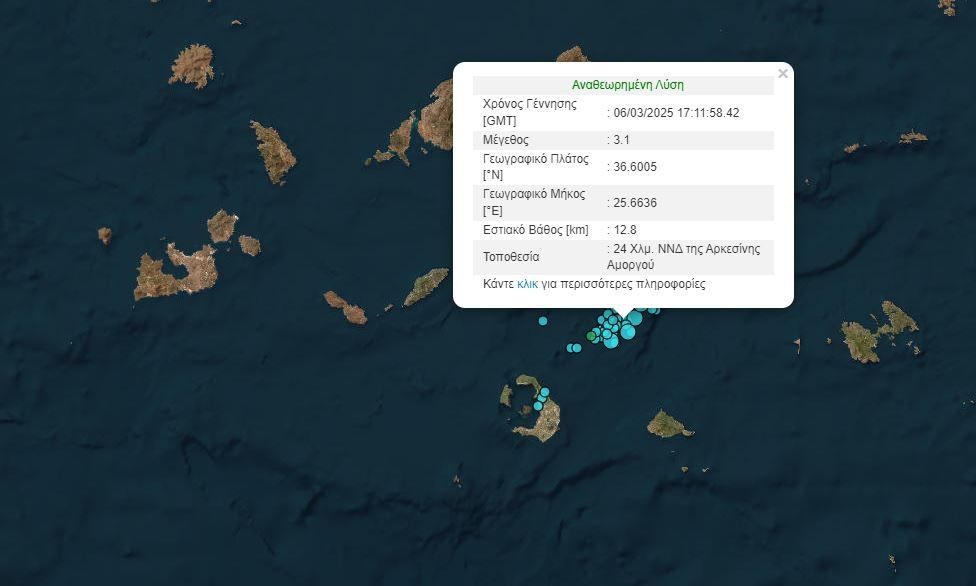 Το επίκεντρο του σεισμού εντοπίστηκε 23 χιλιόμετρα βορειοανατολικά της Οίας, στη θαλάσσια περιοχή κοντά στη Σαντορίνη.