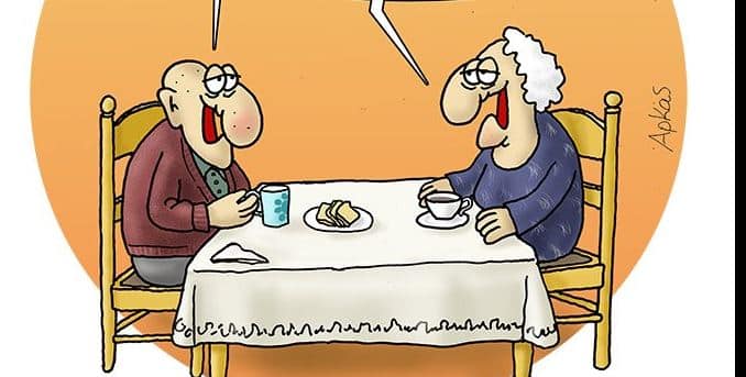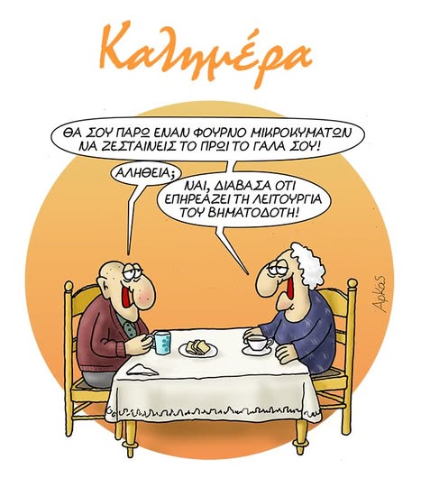 Σε αυτό, ένα ηλικιωμένο ζευγάρι απολαμβάνει το πρωινό του. Η σύζυγος, με μια δόση… υπόγειας πρόθεσης, προτείνει στον άντρα της να του αγοράσει έναν φούρνο μικροκυμάτων για να ζεσταίνει το πρωινό του γάλα. Ο σύζυγος, φανερά έκπληκτος, ρωτά: «Αλήθεια;». Τότε εκείνη, με φαινομενικά αθώο ύφος, του απαντά: «Ναι, διάβασα ότι επηρεάζει τη λειτουργία του βηματοδότη!».