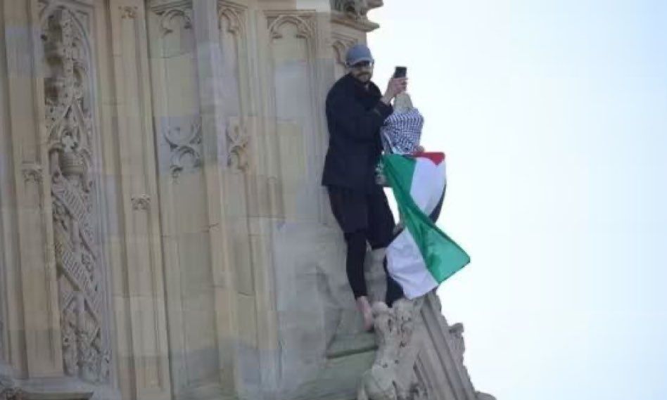 Άνδρας ο οποίος αναρριχήθηκε χθες Σάββατο το πρωί στον πύργο όπου βρίσκεται το ρολόι Μπιγκ Μπεν του Λονδίνου κι ανέμισε παλαιστινιακή σημαία συνελήφθη, ανακοίνωσε σήμερα η αστυνομία της πρωτεύουσας της Βρετανίας.