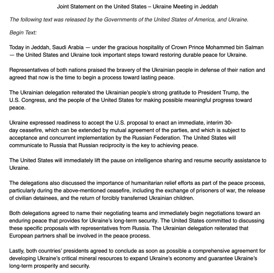 Οι διαπραγματεύσεις πραγματοποιήθηκαν την Τρίτη (11/3) στην Τζέντα και κατέληξαν σε μια προκαταρκτική συμφωνία μεταξύ Ουκρανίας και Ηνωμένων Πολιτειών για την εφαρμογή κατάπαυσης του πυρός 30 ημερών. Ο Αμερικανός πρόεδρος Ντόναλντ Τραμπ επιβεβαίωσε τη συμφωνία, εκφράζοντας την ελπίδα ότι και η ρωσική πλευρά θα την αποδεχθεί.