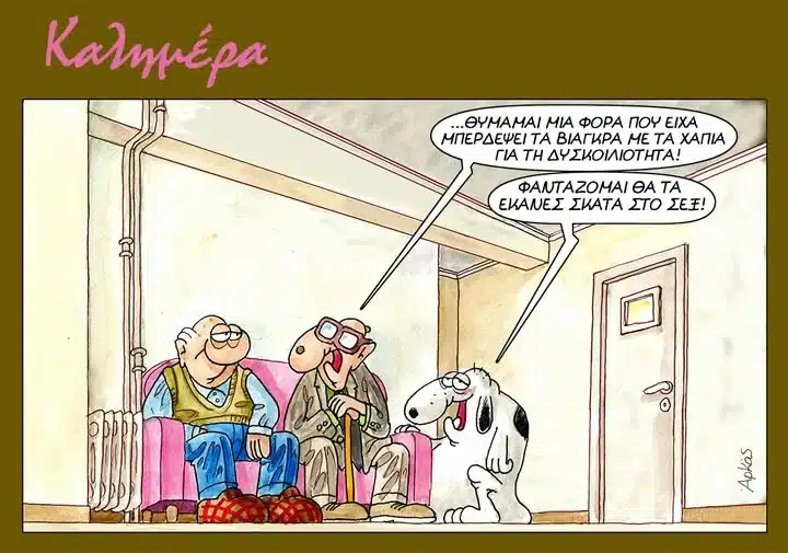 Στο σημερινό του σκίτσο, πρωταγωνιστούν δύο ηλικιωμένοι φίλοι που κάθονται σε έναν καναπέ, συζητώντας τις περιπέτειές τους με τα φάρμακα. Ο ένας εξομολογείται πως κάποτε μπέρδεψε τα χάπια για τη στυτική δυσλειτουργία με εκείνα για τη δυσκοιλιότητα. Η απάντηση του σκύλου τους, που πάντα έχει την τελευταία λέξη, είναι αφοπλιστική: «Φαντάζομαι θα τα έκανες… σκατά στο σεξ!»