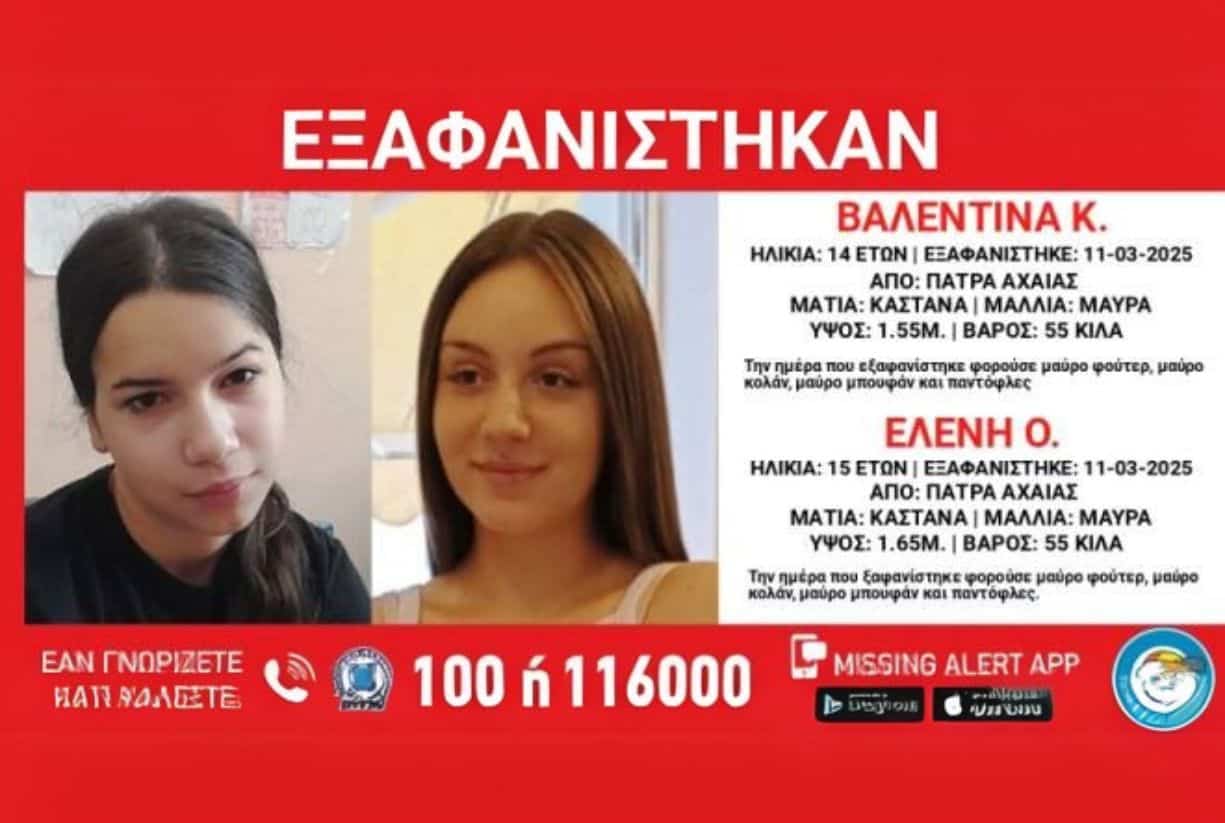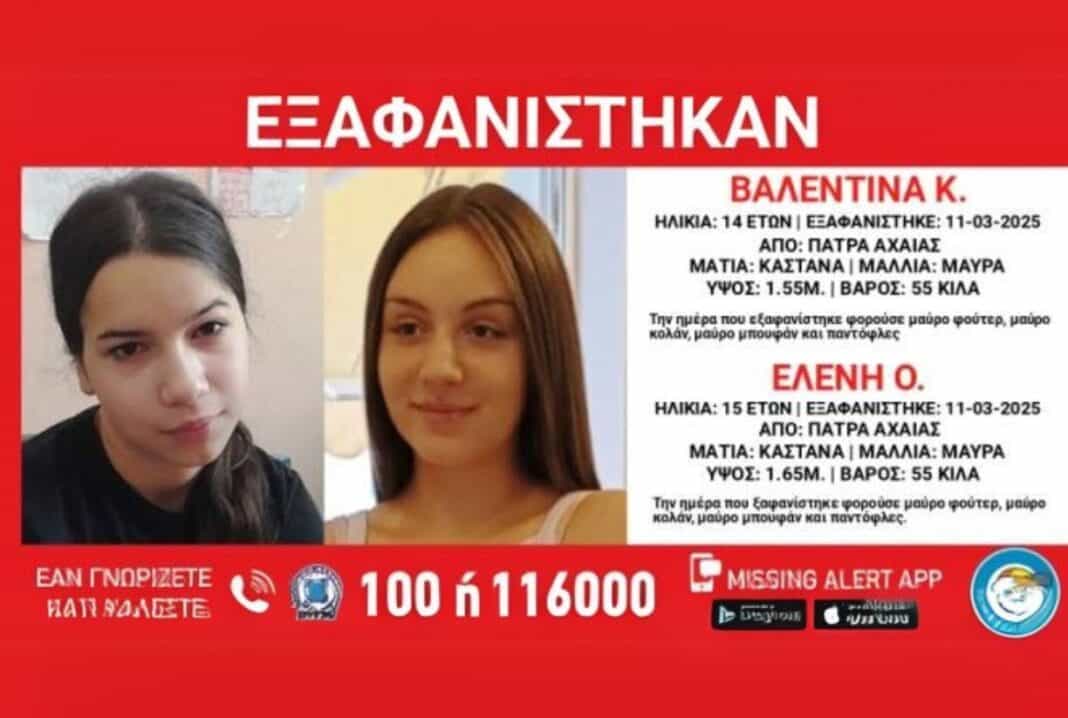 Στις 11/03/2025 και ώρα 19:00, εξαφανίστηκαν από χώρο παιδικής προστασίας στην περιοχή της Πάτρας, η Βαλεντίνα Κ. 14 ετών και η Ελένη Ο. , 15 ετών. Το «Χαμόγελο του Παιδιού» ενημερώθηκε και προχώρησε άμεσα σε δημοσιοποίηση των στοιχείων των ανήλικων κατόπιν εισαγγελικής εντολής.