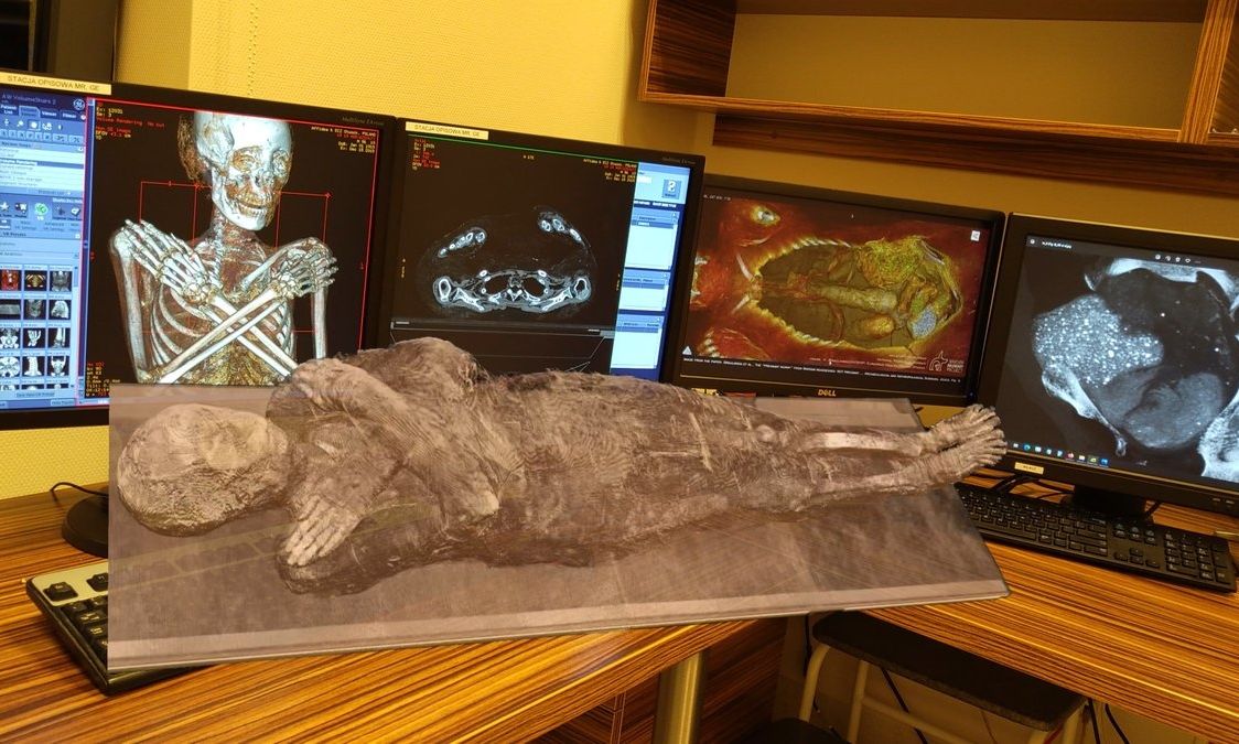 Στην πρώτη δημοσιευμένη μελέτη της μούμιας, οι ερευνητές χρησιμοποίησαν απεικόνιση ακτίνων Χ και αξονικές τομογραφίες για να εντοπίσουν αρκετές δέσμες μουμιοποιημένων οργάνων στην κοιλιά της. Πρότειναν επίσης ότι ένα κακώς διατηρημένο έμβρυο, περίπου 28 εβδομάδες σε ηλικία κύησης, θα μπορούσε να παρατηρηθεί στις σαρώσεις.