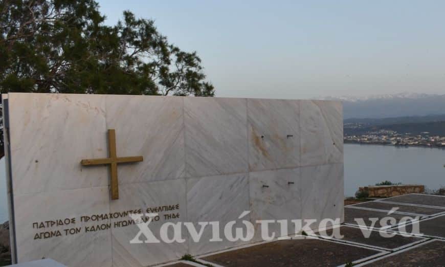 Σύμφωνα με τα Χανιώτικα Νέα, το Μνημείο αυτό δυστυχώς θεωρήθηκε στόχος αγνώστων δραστών οι οποίοι ξήλωσαν και πήραν τη μεγάλη ορειχάλκινη ασπίδα η οποία ήταν στερεωμένη στη δεξιά κάθετη πλευρά του Μνημείου.