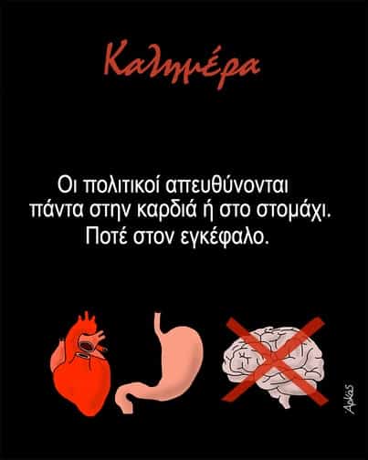 Στο σημερινό του σκίτσο, σε φόντο μαύρο, παρουσιάζει μια καρδιά, ένα στομάχι και έναν εγκέφαλο που έχει διαγραφεί με ένα μεγάλο κόκκινο Χ. Το μήνυμα που συνοδεύει την εικόνα είναι ξεκάθαρο: