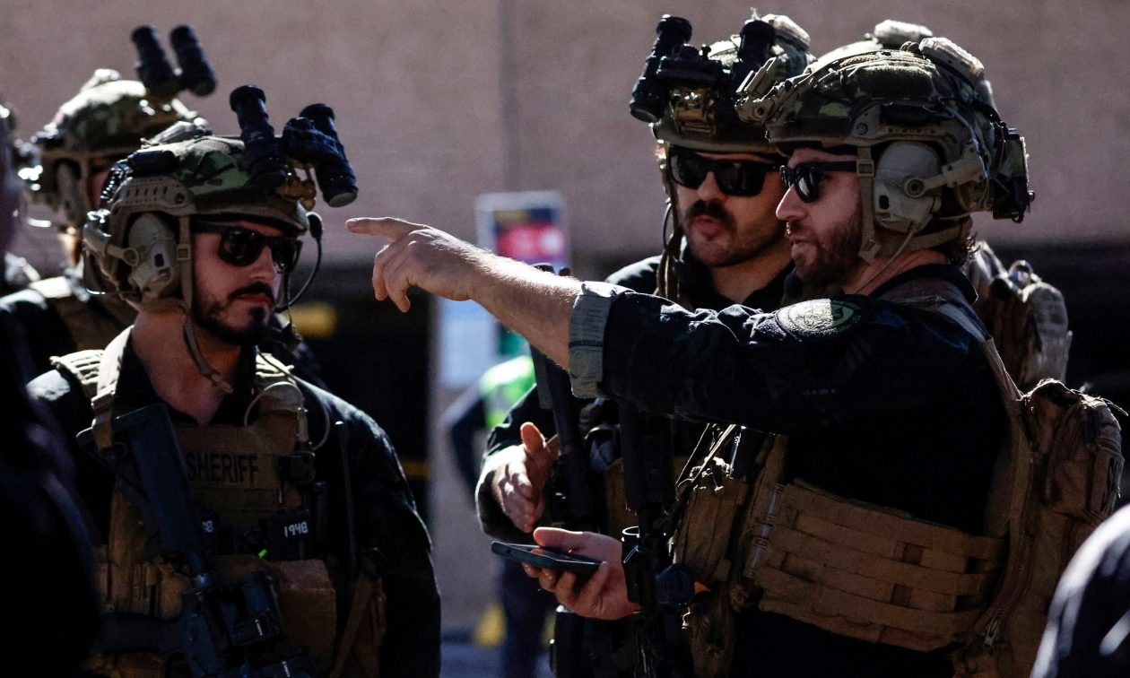 Μια ζωντανή μετάδοση δείχνει τις αρχές στη σκηνή, συμπεριλαμβανομένων τεθωρακισμένων οχημάτων.