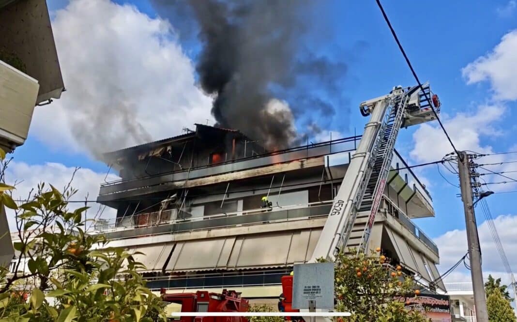 Δυο άνθρωποι έχουν αποκλειστεί στην ταράτσα, ενώ δυο όροφοι καίγονται ολοσχερώς.