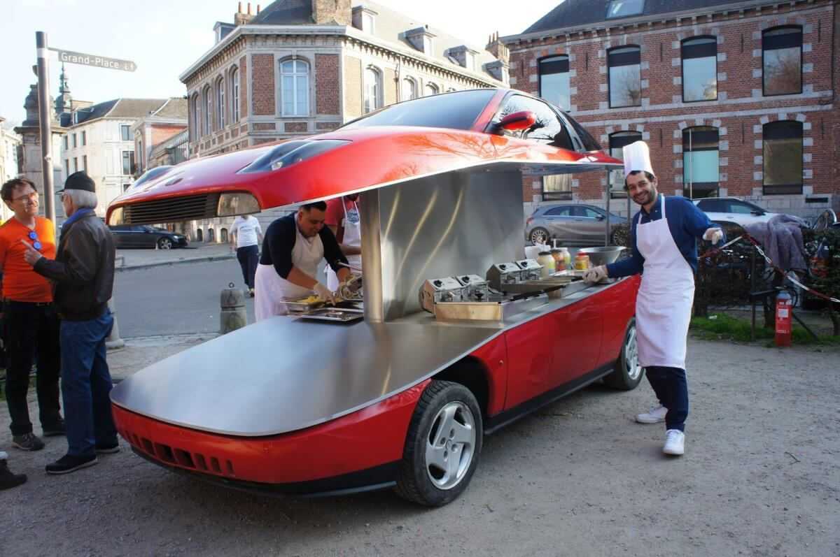 Αυτή τη φορά μετέτρεψε ένα κόκκινο κουπέ της Fiat σε καντίνα, για την ακρίβεια σε μια friterie (όπου προσφέρουν τηγανιτές πατάτες), κόβοντάς το οριζόντια στη μέση.