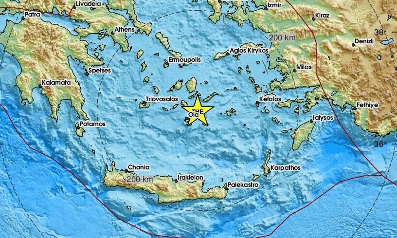 Το ακριβές επίκεντρο τη δόνησης εντοπίζεται στα 40 χλμ. βορειοανατολικά από την Οία.