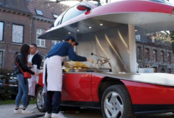 Αυτή τη φορά μετέτρεψε ένα κόκκινο FIAT Coupé σε καντίνα, για την ακρίβεια σε μια friterie, όπου προσφέρουν αποκλειστικά τηγανιτές πατάτες, κόβοντάς το οριζόντια στη μέση.