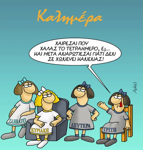 Το Σάββατο, η Κυριακή και η Τρίτη κάθονται ανέμελες και χαμογελαστές, με τη Δευτέρα να τις κοιτά με αυστηρό ύφος και να λέει: «Χαίρεσαι που χάλασες το τετραήμερο, ε;… Και μετά αναρωτιέσαι γιατί δεν σε χωνεύει κανένας!»