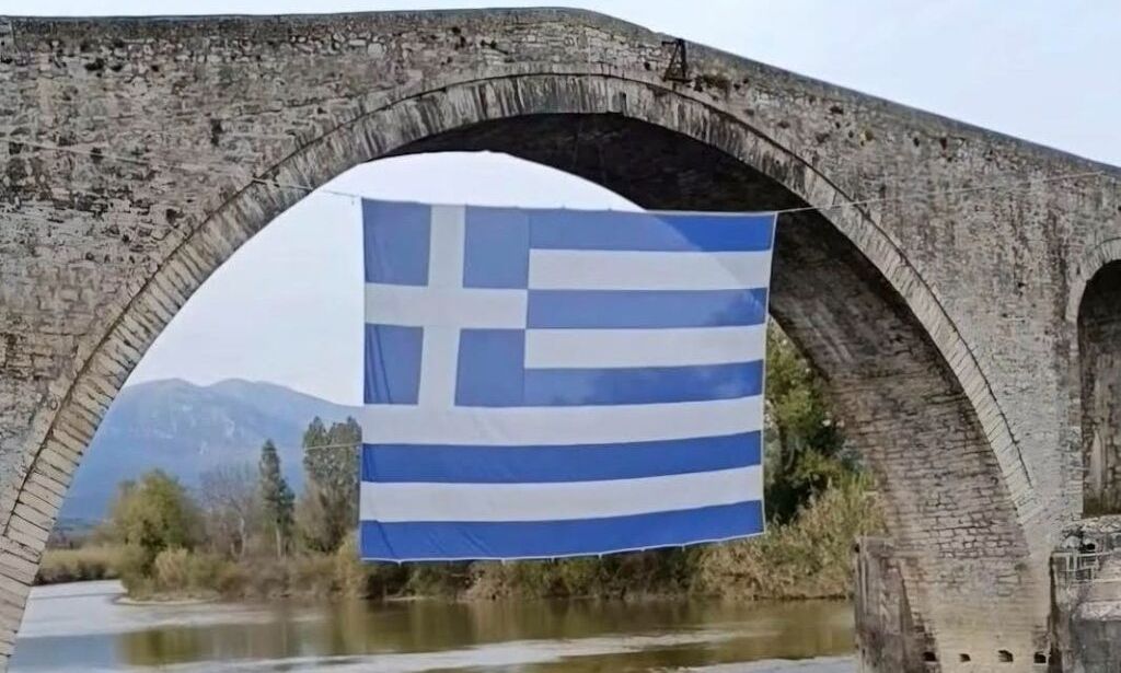 Μία μεγάλη γαλανόλευκη σημαία υψώθηκε στο ιστορικό γεφύρι της Άρτας στο πλαίσιο του εορτασμού της Εθνικής Επετείου της 25ης Μαρτίου.