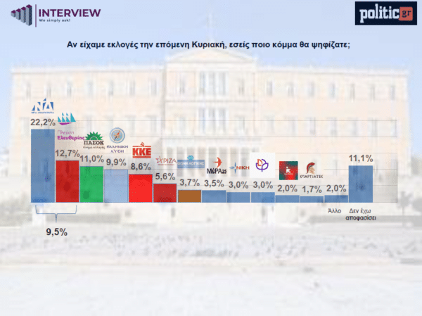 Νέα δυναμική καταγράφεται στο πολιτικό σκηνικό σύμφωνα με τη φρέσκια δημοσκόπηση της Interview για το Politic.gr, που δείχνει περαιτέρω αποδυνάμωση της Νέας Δημοκρατίας και άνοδο νέων πολιτικών παικτών. Συγκεκριμένα, η ΝΔ σημειώνει πτώση και βρίσκεται στο 22,2%, καταγράφοντας απώλεια 2,3 ποσοστιαίων μονάδων σε σχέση με τη μέτρηση του Φεβρουαρίου.