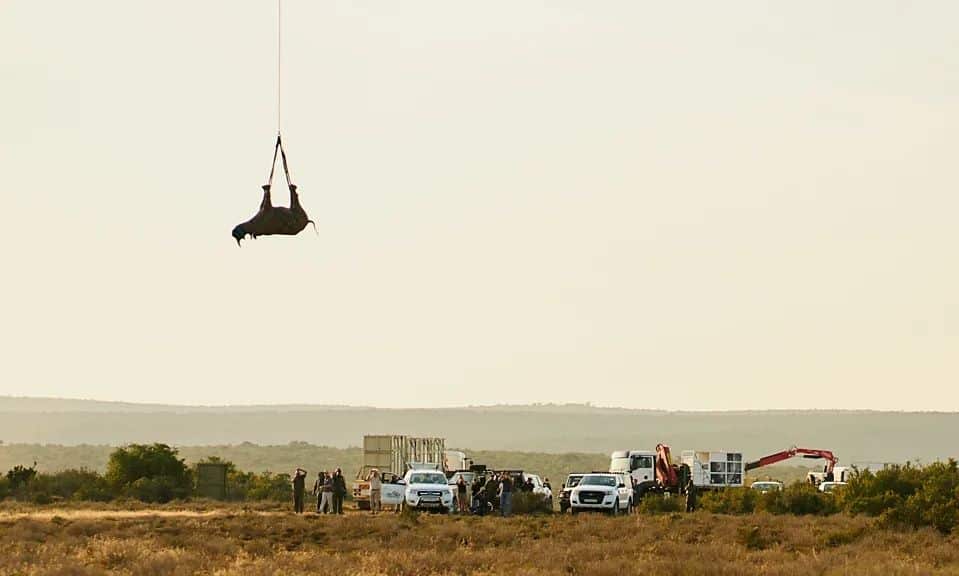 Πετώντας στον ουρανό πάνω από τη Νότια Αφρική, ένα φυτοφάγο ζώο βάρους 1.300 κιλών κρέμεται ανάποδα από τα πόδια του από ένα ελικόπτερο.