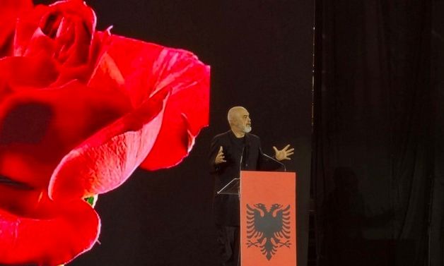 Ο Έντι Ράμα απευθύνεται αυτήν την ώρα σε Αλβανούς ομογενείς που κατοικούν και δραστηριοποιούνται στην Κρήτη, στο Κλειστό Γήπεδο Κλαδισού, στα Χανιά. Η αλβανική ομογένεια που αριθμεί περίπου 35.000 μέλη στο νησί.