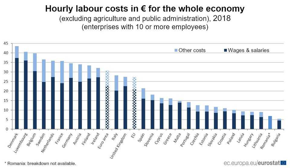 Σύμφωνα με την Eurostat, το χαμηλότερο ωριαίο κόστος εργασίας καταγράφηκε στη Βουλγαρία (€ 5,4), τη Ρουμανία (€ 6,9), τη Λιθουανία (€ 9,0), την Ουγγαρία (€ 9,2) και τη Λετονία (€ 9,3) και το υψηλότερο στο Λουξεμβούργο (€40,6 ), το Βέλγιο (€39,7) τη Σουηδία (€36,6 ), τις Κάτω Χώρες (€35,9 ) και τη Γαλλία (€ 35,8).