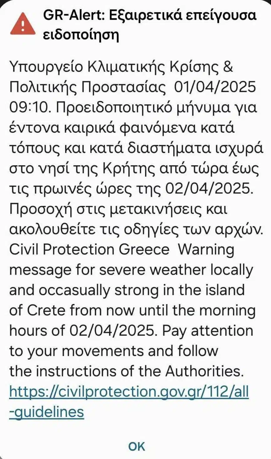 Δ. Στην Κρήτη (κυρίως στη δυτική και τη νότια Κρήτη) και τη Γαύδο έως και τις πρωινές ώρες της Τετάρτης (02-04-25).