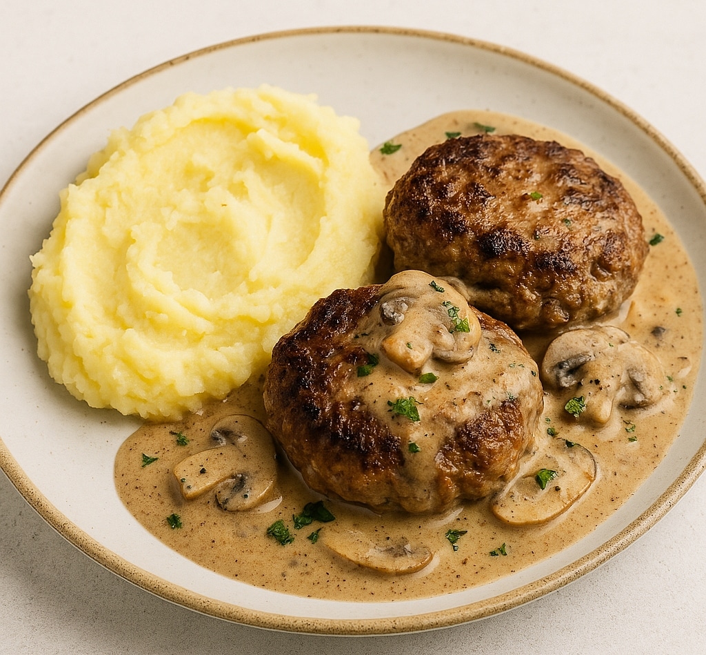 Μια comfort food συνταγή που συνδυάζει την παράδοση με τη γκουρμέ απόλαυση είναι τα ζουμερά μπιφτέκια από μοσχαρίσιο κιμά με πλούσια σάλτσα μανιταριών, κρέμα γάλακτος και μουστάρδα. Συνοδεύονται τέλεια με πουρέ πατάτας ή πιλάφι.