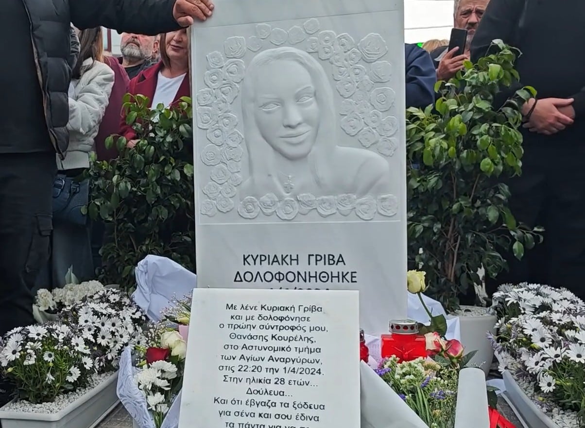Νωρίτερα, το απόγευμα της Τρίτης (1/4) έγιναν τα αποκαλυπτήρια του μνημείου της Κυριακής Γρίβα, ως μία συμβολική κίνηση τιμής στην 28χρονη, έξω από το Αστυνομικό Τμήμα των Αγίων Αναργύρων, στο ίδιο σημείο όπου ακριβώς πριν από έναν χρόνο έπεσε θύμα βάναυσης δολοφονίας από τον 39χρονο σύντροφό της χωρίς να δεχτεί την παραμικρή συμπόνια και βοήθεια.