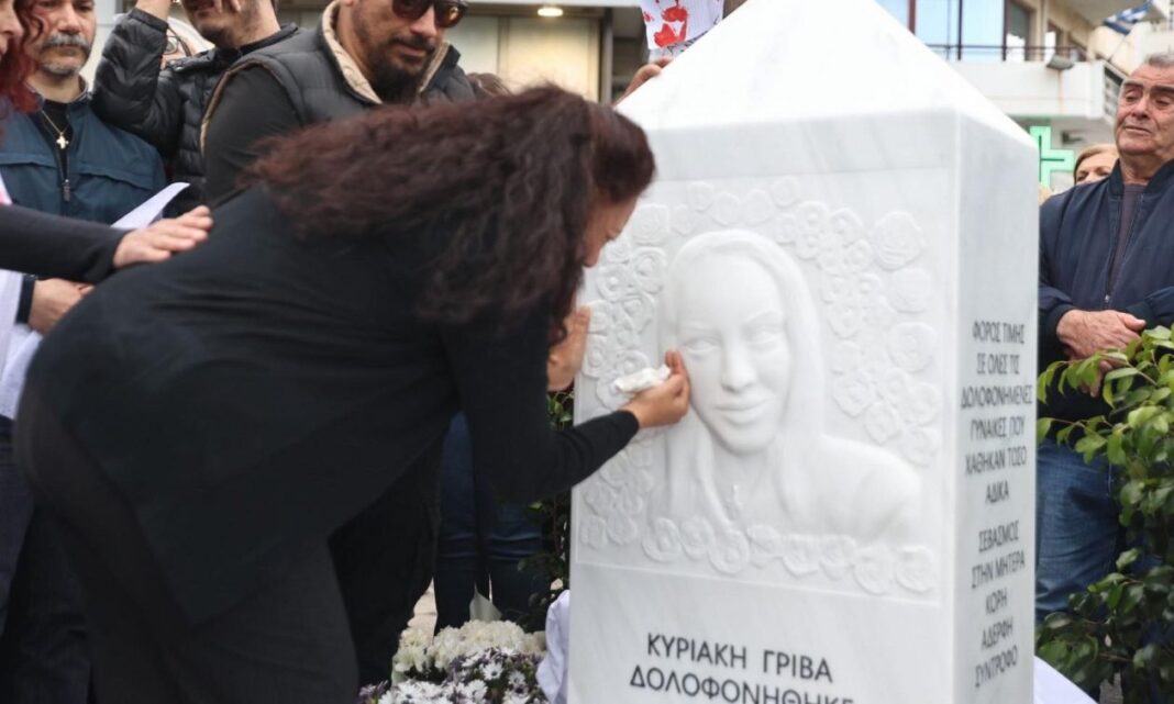 Συγγενείς, φίλοι, φορείς, ενώσεις κατά της έμφυλης βίας, συγκεντρώθηκαν την περασμένη Τρίτη (01.04.2025) έξω από το αστυνομικό τμήμα στους Αγίους Αναργύρους, για τα αποκαλυπτήρια του μνημείου για την Κυριακή Γρίβα με την μητέρα της, να σπαράζει τη στιγμή των αποκαλυπτηρίων του μνημείου.
