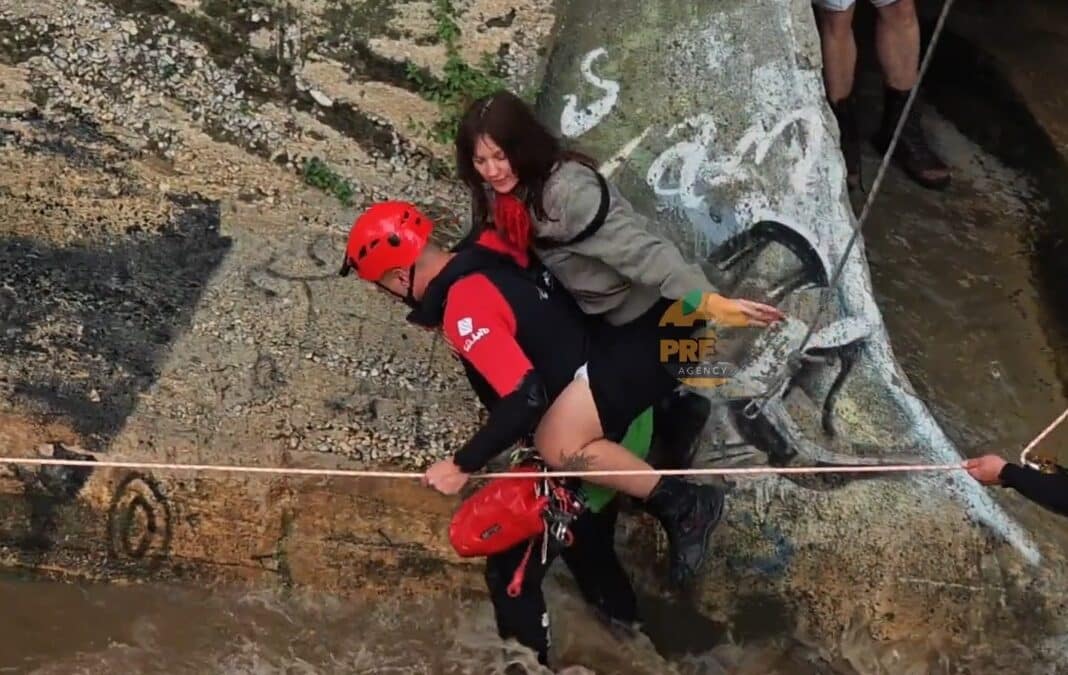 Μια «κινηματογραφική» επιχείρηση της ΕΜΑΚ στήθηκε για τον απεγκλωβισμό των δύο νεαρών τουριστών από το ρέμα Προμπονά που είχε φουσκώσει επικίνδυνα λόγω της βροχής.