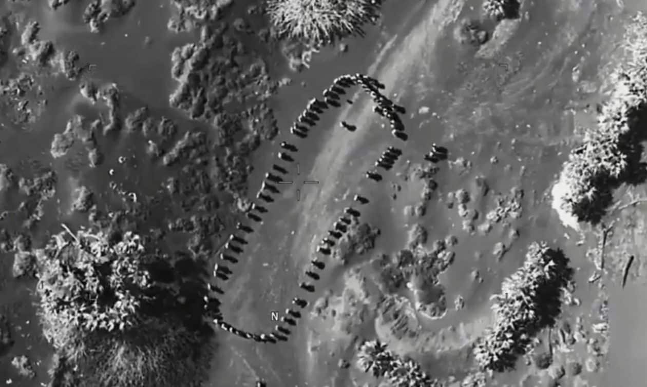 Οι εικόνες, ασπρόμαυρες, τραβηγμένες από ψηλά —κατά πάσα πιθανότητα από στρατιωτικό drone— δείχνουν δεκάδες ανθρώπους που έχουν σχηματίσει κύκλο, προτού πέσει βόμβα.