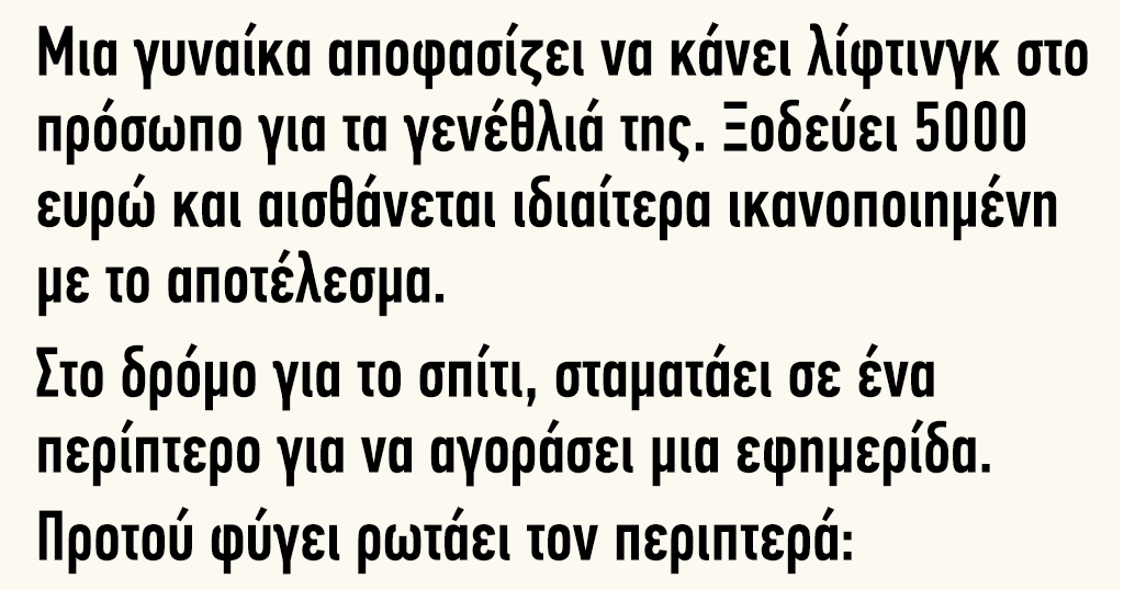 Μια γυναίκα αποφασίζει να κάνει λίφτινγκ στο πρόσωπο για τα γενέθλιά της 16 Μαΐου 2019 23:18 FacebookTwitterTelegramViberWhatsAppLinkedinEmail FacebookTwitterTelegramViberWhatsAppLinkedinEmail Προηγούμενο άρθροΑτύχημα στο MasterChef: Ο Ιωαννίδης χτύπησε τον Κοντιζά- Οι φωνές και η «συγγνώμη» (video)Επόμενο άρθροΣυγκινητικό: 5χρονος Αφγανός χορεύει με το προσθετικό του πόδι – Δείτε την απίστευτη ιστορία του Μπορεί να σας αρέσουν Ανέκδοτα 45αρης “καυτός” σε ανέκδοτο: “Έτσι βγαίνει ένα διαζύγιο” 25 Νοεμβρίου 2025 20:18 Ανέκδοτα Βουνίσιος βοσκός σε ανέκδοτο: Δεν έβρισκε λύση… 25 Νοεμβρίου 2025 17:18 Ανέκδοτα Ξανθιά γειτόνισσα σε ανέκδοτο “Γιατί κοκκινίζουν;” 25 Νοεμβρίου 2025 13:54 Αφήστε ένα μήνυμα Σχόλιο: εισάγετε το σχόλιό σας! Όνομα: παρακαλώ εισάγετε το όνομά σας εδώ Email: έχετε εισάγει εσφαλμένη διεύθυνση ηλεκτρονικού ταχυδρομείου! παρακαλώ εισάγετε εδώ την ηλεκτρονική σας διεύθυνση Ιστοσελίδα: αποθηκεύστε το όνομα, το ηλεκτρονικό ταχυδρομείο και τον ιστότοπό μου σε αυτό το πρόγραμμα περιήγησης για την επόμενη φορά που θα σχολιάσω.