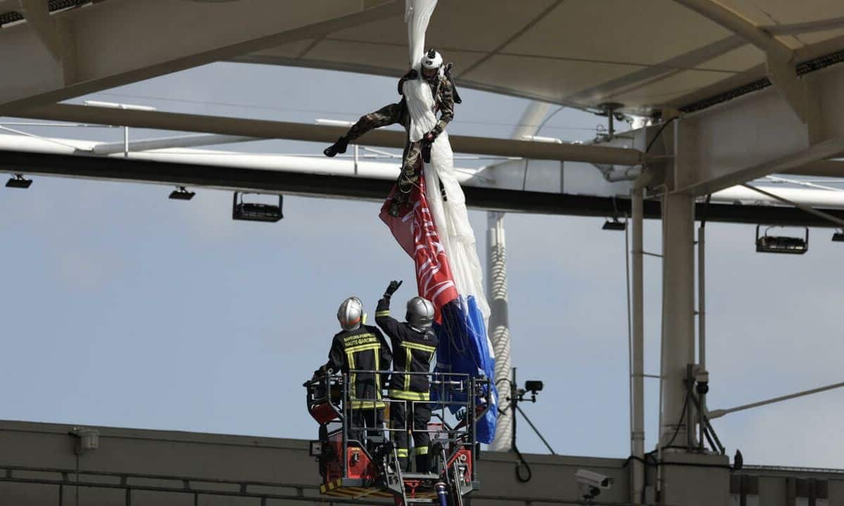Ωστόσο, ενώ οι υπόλοιποι αλεξιπτωτιστές προσγειώθηκαν με ασφάλεια στο γήπεδο, ο ίδιος «κόλλησε» στην οροφή με αποτέλεσμα να καθυστερήσει το παιχνίδι κατά 40 λεπτά.