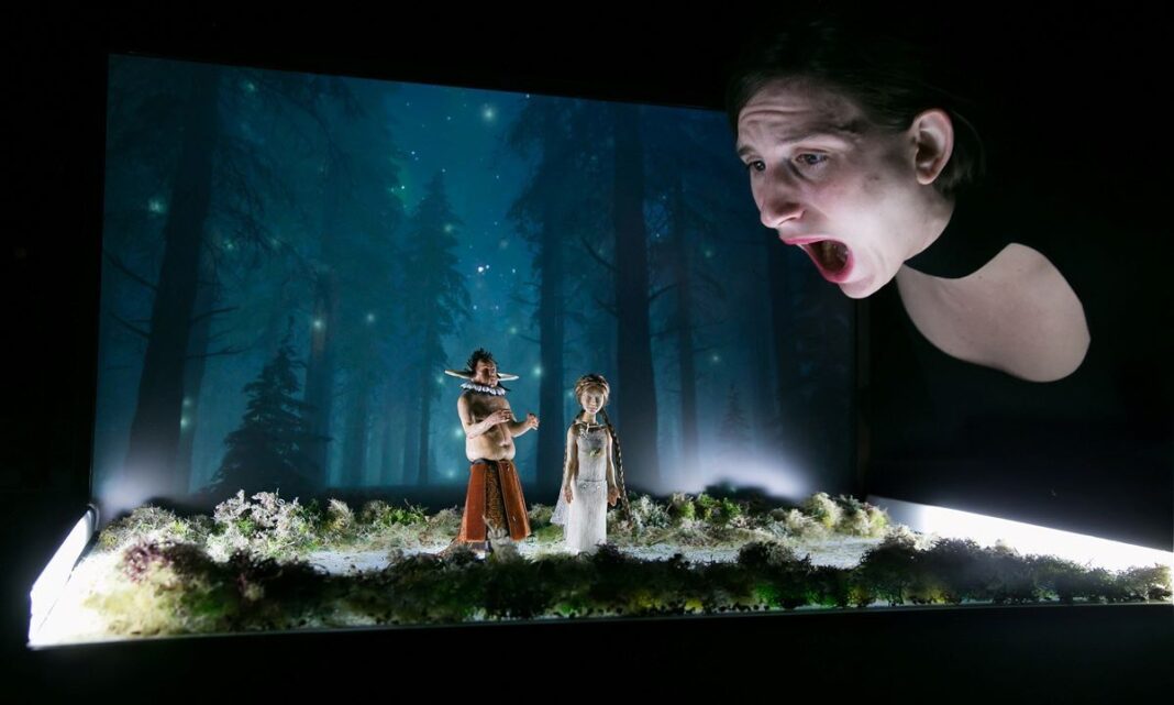 Στο κέντρο του σκηνικού χώρου – αποτελούμενο από δύο οθόνες που ζωντανεύουν τα σκηνικά περιβάλλοντα με την τέχνη της video art – οι δύο ηθοποιοί της παράστασης ξετυλίγουν τον μύθο με την βοήθεια μικρών γλυπτών, που αναπαριστούν τους ήρωες του έργου. Οι απόκοσμες μινιατούρες κινηματογραφούνται και προβάλλονται μεγεθυμένες σε μια τρίτη, μεγάλη οθόνη. Έτσι, από μικροσκοπικά, αδύναμα πλάσματα μέσα στα χέρια των ανθρώπων-θεών, μετατρέπονται σε τεράστια, τρομακτικά τέρατα. Το γεγονός ότι η ιστορία διαδραματίζεται μπροστά στα μάτια μας άλλοτε σε «μικρογραφία» και άλλοτε σε «μεγέθυνση» εντείνει τον τρόμο, τη βία και το τραγικό που εμπεριέχει.
