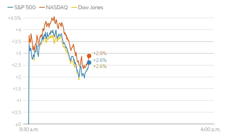 Αυτή τη στιγμή στην Wall Street ο S&P500 καταγράφει άνοδο 2,6%, ο Nasdaq 2,9% και ο Dow Jones 2,6%
