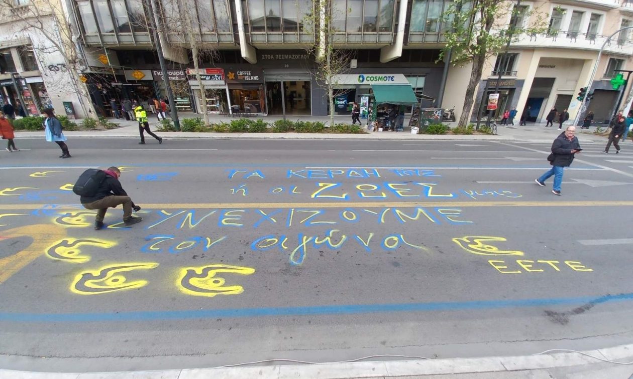 Μάλιστα σε μια συμβολική κίνηση διαδηλωτές έγραψαν στο οδόστρωμα της οδού Πανεπιστημίου σύνθημα που λέει: Τα κέρδη τους οι ζωές μας, συνεχίζουμε τον αγώνα.