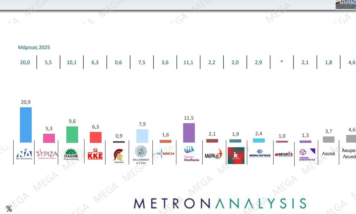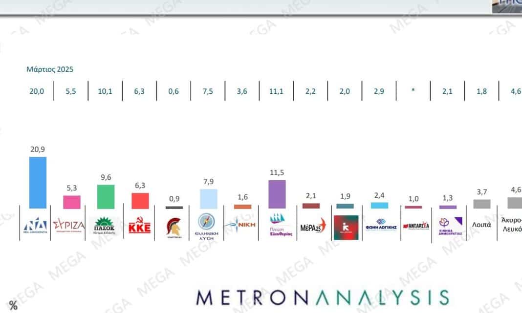 Ανάκαμψη καταγράφει η Νέα Δημοκρατία στη νέα δημοσκόπηση της Metron Analysis.