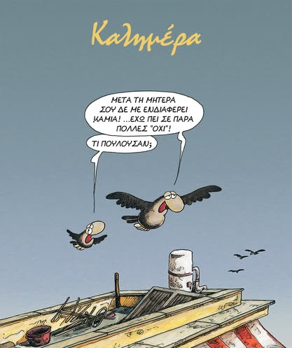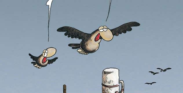 Ο Αρκάς, με τη χαρακτηριστική του σατιρική ματιά, σχολιάζει τις σχέσεις των καιρών μας μέσα από ένα χιουμοριστικό – αλλά άκρως ουσιαστικό – σκίτσο. Ένα μεγάλο πουλί, κουρασμένο από τις απογοητεύσεις, λέει στον νεαρό γιο του: