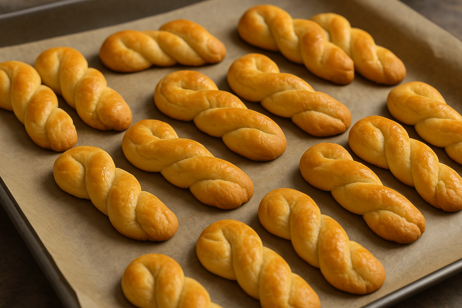 Πλάθουμε κουλουράκια σε διάφορα σχήματα και τα τοποθετούμε σε ταψί με λαδόκολλα.