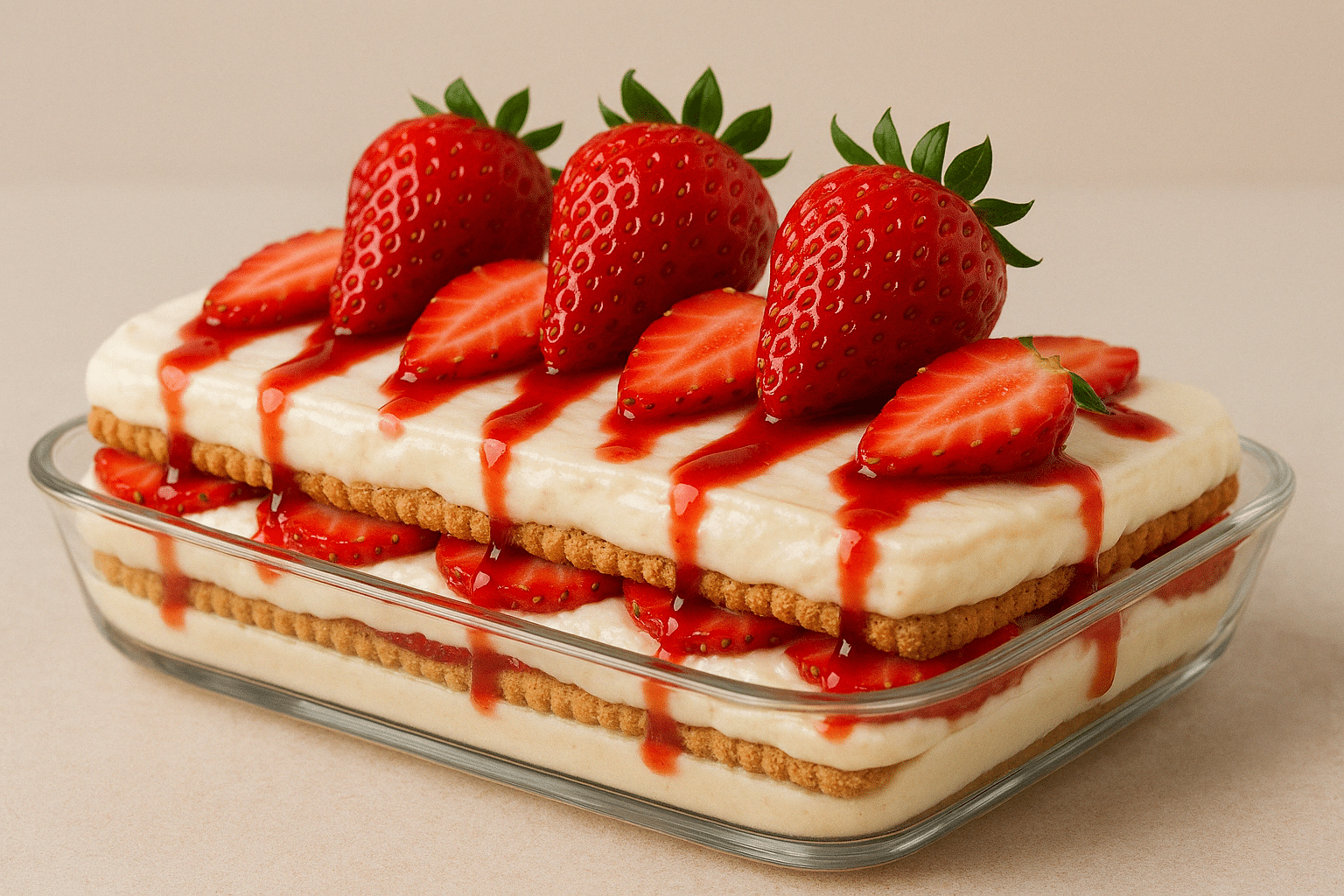 Ένα εύκολο και δροσιστικό γλυκό ιδανικό για την άνοιξη και το καλοκαίρι, που συνδυάζει τραγανά μπισκότα με αφράτη κρέμα και ζουμερές φράουλες. Χωρίς ψήσιμο, με απλά υλικά και εντυπωσιακή εμφάνιση, αυτό το γλυκό θα σε βγάλει ασπροπρόσωπο σε κάθε περίσταση!