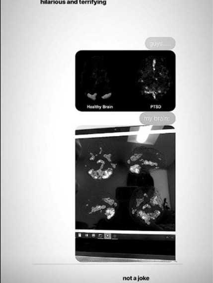 Στη μία φωτογραφία φαίνεται ένας υγιής εγκέφαλος ενώ στην άλλη ένας που πάσχει από PTSD. Κάτω από αυτές τις δύο φωτογραφίες δείχνει την αξονική του δικού της εγκεφάλου όπου τα επίπεδα του PTSD είναι πολύ υψηλότερα του κανονικού.