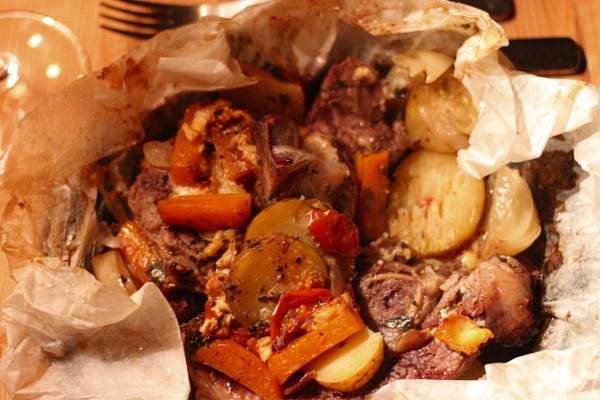 Τύλιγμα: Σε μεγάλο κομμάτι λαδόκολλας (ή και δύο μαζί), τοποθετούμε τις πατάτες και από πάνω το αρνί με το μαρινάρισμα. Προσθέτουμε το κρεμμύδι και τις δάφνες. Τυλίγουμε σφιχτά και στη συνέχεια τυλίγουμε με αλουμινόχαρτο.