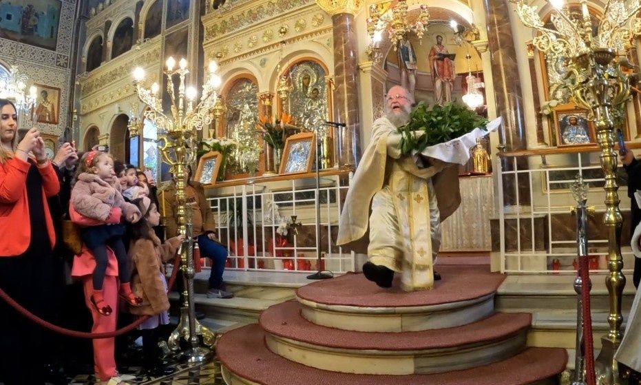 Λίγο μετά τις 8:30 το πρωί το ιερό άνοιξε και ο ιερέας έραινε με βάγια τους πιστούς, οι οποίοι όπως προστάζει το έθιμο, χτυπούσαν τα στασίδια.