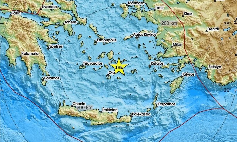 Το ακριβές επίκεντρο τη δόνησης εντοπίζεται στα 38 χλμ. βορειοανατολικά από την Οία.