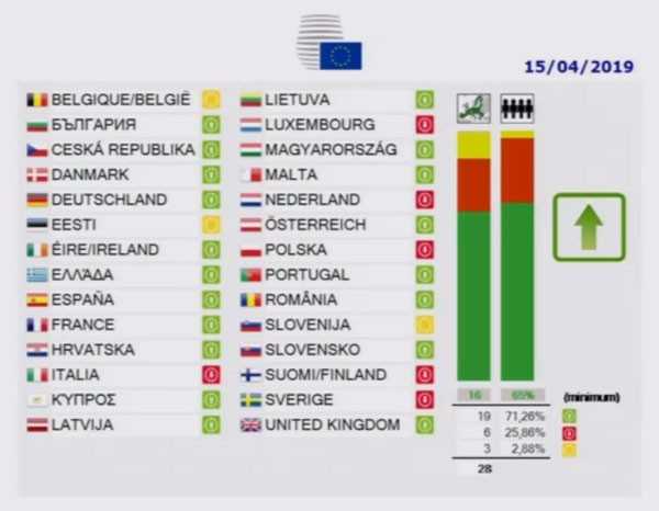 Από τις 28 χώρες της ΕΕ, οι 19 ψήφισαν υπέρ του νομοσχεδίου (ανάμεσα τους και η Ελλάδα) που περιλαμβάνει τα Άρθρα 11 (tax link) και 13 (upload filter), 3 λευκό (Βέλγιο, Εσθονία και Σλοβενία) και 6 κατά (Ιταλία, Ολλανδία, Λουξεμβούργο, Πολωνία, Φινλανδία και Σουηδία).